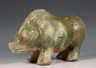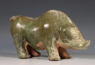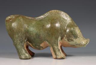 China, green-glazed earthenware model of a pig, Han dynasty (206 BC- 220 AD), the head and snout realistically modelled in relief, covered with a partially iridescent glaze. Private collection The Hague, collected in the 1990's.