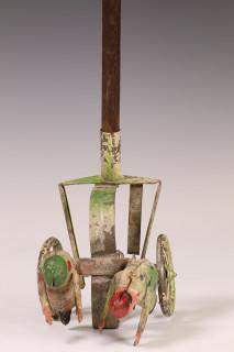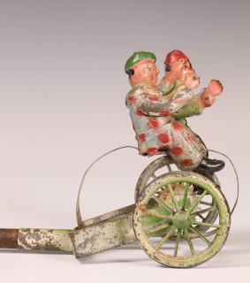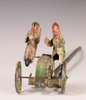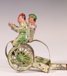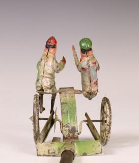 Uitgevoerd met twee figuren met veer mechanisme en twee wielen. (gebruikssporen).