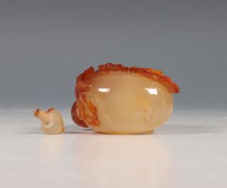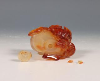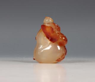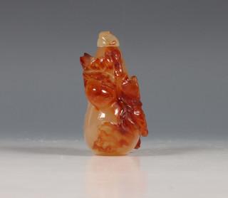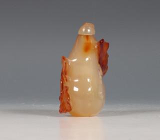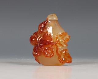 China, agathe snuff bottle, 20th century, carved through caramel layers with a butterfly on a flowering branch. Condition: some chips to leaves.