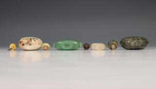 bestaande uit een zeegroene jade snuiffles, een wit geaderd en een crème jade flesje en een gespikkeld groen hardstenen flesje