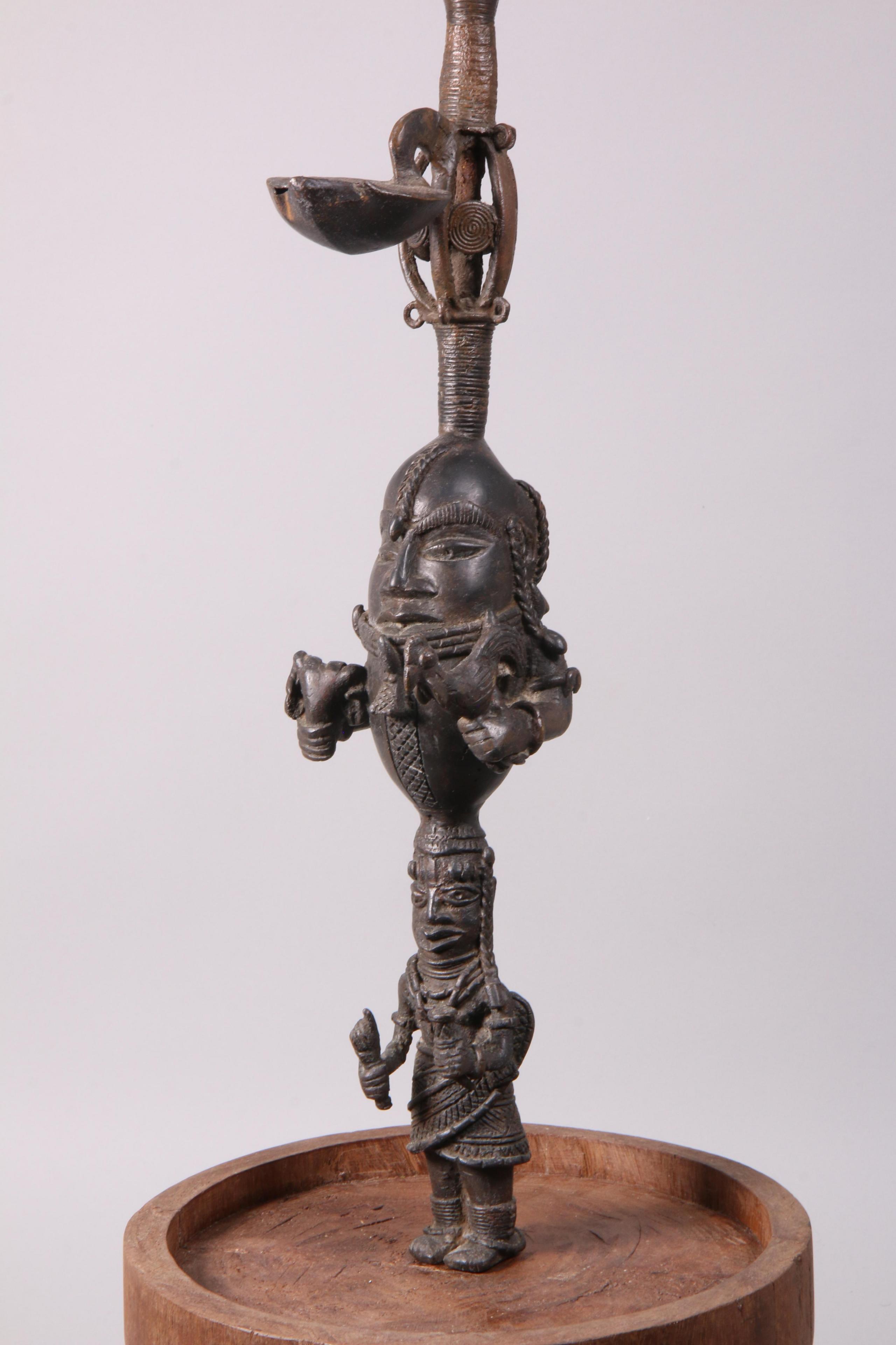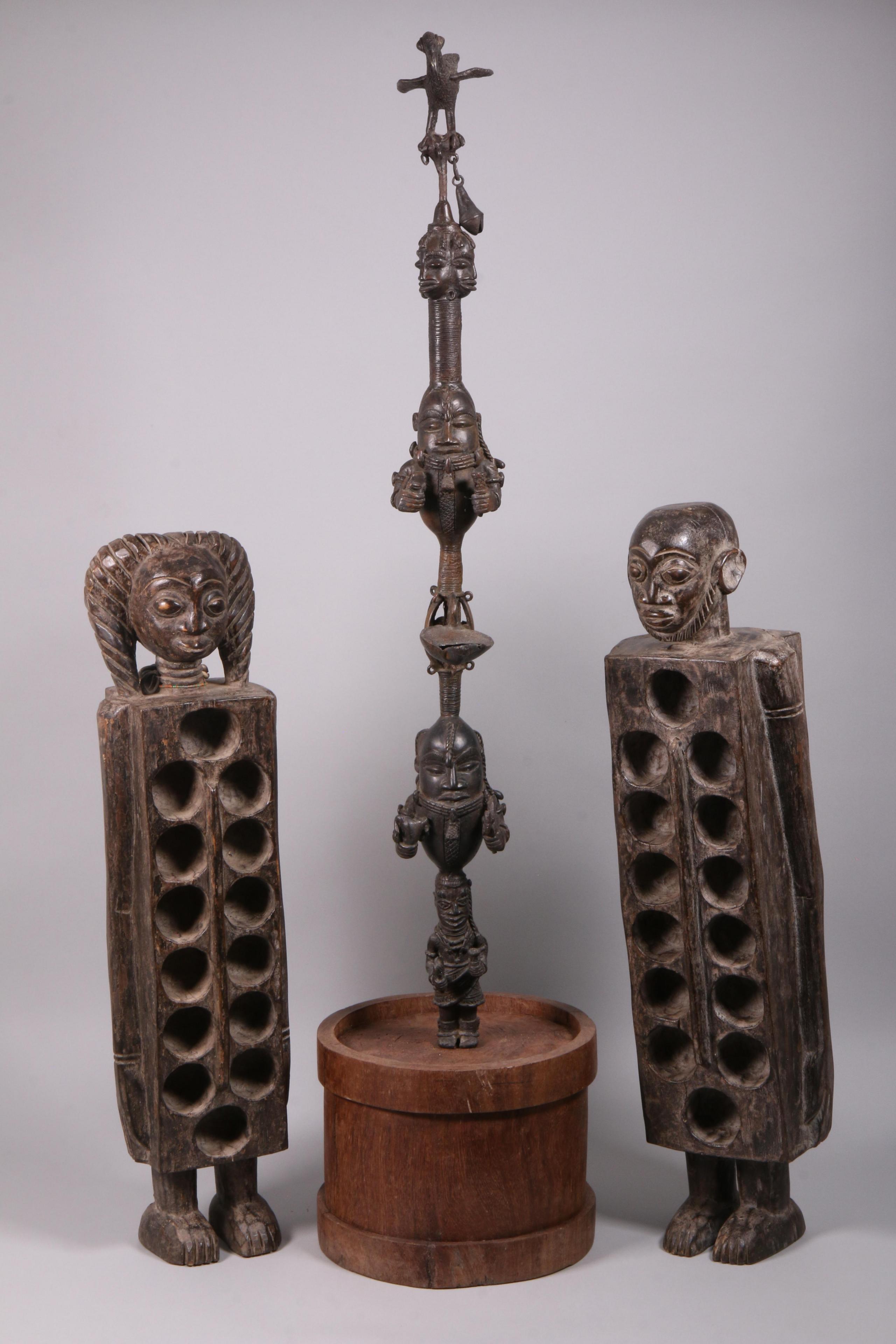 Twee houten Afrikaanse spellen en een Afrikaanse bronzen olielamp