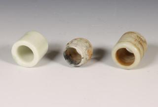 China, three jade archer's rings, one even, the others with decoration. Condition: some wear as expected.