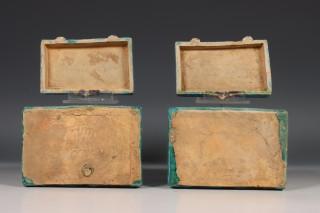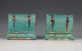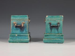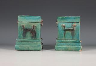China, paar fahua blauw en turquoise geglazuurde aardewerken modellen van kisten, Ming-dynastie (1368-1644),
