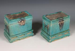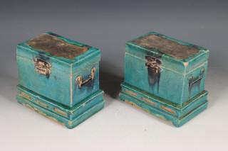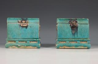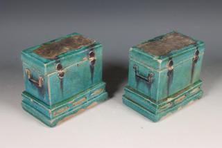 China, pair of fahua blue and turquoise glazed earthenware models of chests, Ming dynasty (1368-1644), each realistically modelled and with loose cover, covered with a turquoise and bluish purple glaze