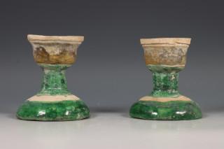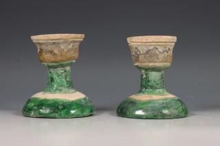 China, pair of sancai-glazed earthenware offering dishes, Ming dynasty (1368-1644), the cylindrical dishes raised on a high foot, covered with an ochre and green glaze