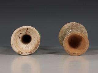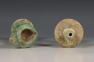 de olielamp gemodelleerd met geometrische banden en bedekt met een oker en groen glazuur, de kleine kandelaar bedekt met een iriserend glazuur