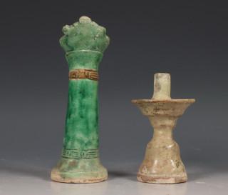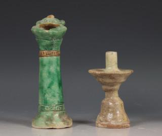 China, sancai geglazuurde aardewerken olielamp en een kandelaar, Ming-dynastie (1368-1644),