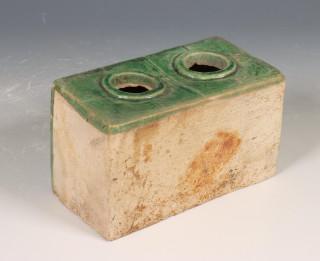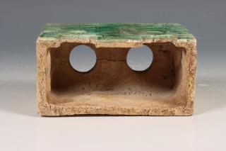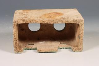 gemodelleerd met twee openingen, de voorzijde gevormd als stenen, bedekt met een groen glazuur