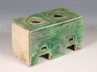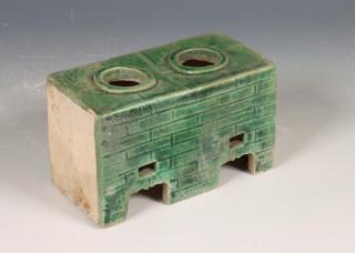 China, green-glazed earthenware model of an oven, Ming dynasty, modelled with two apertures, the front formed as bricks, covered with a green glaze