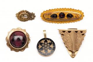 Hierbij een antieke hanger met zwart email en zaadparels, een deel van een boeksluiting en een broche (kapot)