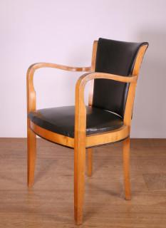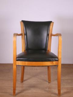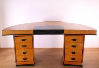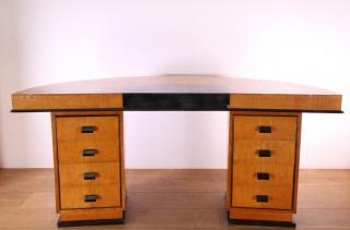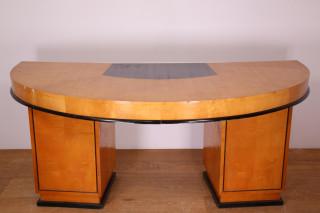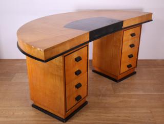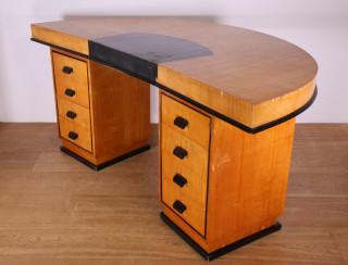 met halfrond blad en twee ladenblokken, ieder met vier laden. Het geheel versierd met gezwart bieswerk. Hierbij berkenhouten armstoel met groene skai bekleding