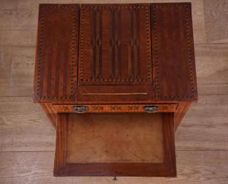met twee deurtjes, lade, uittrekblad met bruin leder en uitklapbaar lessenaartje. Het geheel versierd met fijnhouten bieswerk en parqueterie