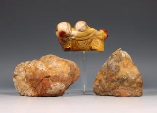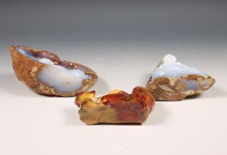 twee melkwit en lichtblauw van kleur, de derde rood en geel