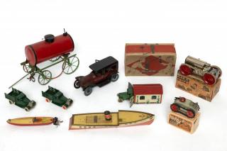 Mogelijk Bing limousine, garage met limousine Lehmann, mod. 771, Louis Marx tractor in originele doos, Midget climbing fighting tank made by Louis Marx in orriginele verpakking, twee blikken boten, blikken tankwagen in originele verpakking, Enfoe kraanwagen in originele doos en twee gietijzeren auto's.