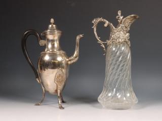 Kristallen karaf, kan met zilveren montering en Ercuis, pleet koffiekan