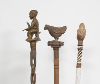 Staff with finial of a hand holding an egg, one with faded gold paint, the finial of a man on a stool, a gun on his lap, a sword in the other hand and one with a finial of a bird.