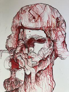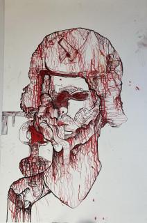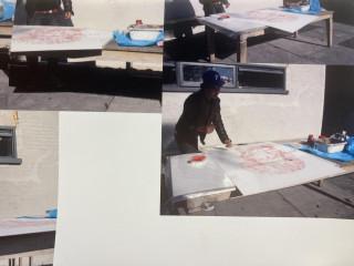 inkt en acryl op papier, niet ingelijst, ongesign., met foto's waarop de kunstenaar dit werk maakt, 2009, 150 x 100 cm.