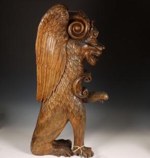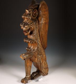 Houten gestoken sculptuur van een gevleugelde leeuw, laat 19e eeuw.