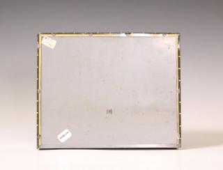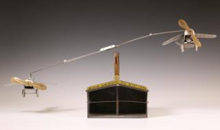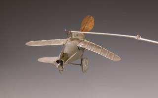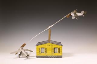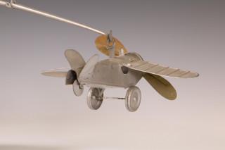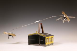 Gelithografeerd blik. Hangar met stellage en twee vliegtuigen.