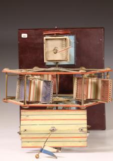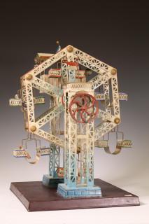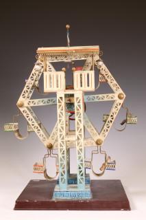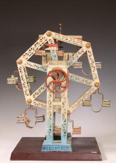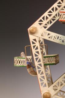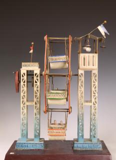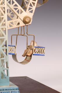 Uitgevoerd in beschilderd blik. Met zes gondels. Staande tussen uitkijktoren en handmechanische toren.
