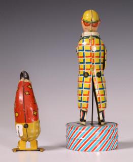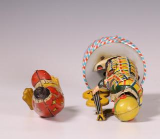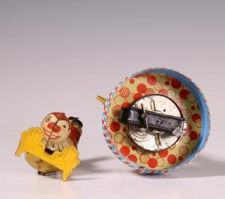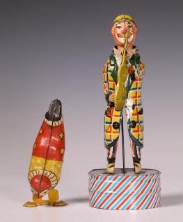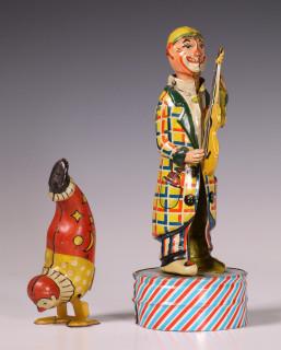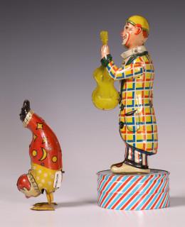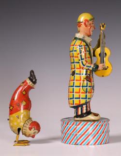 Gelithografeerd blik met opwind mechaniek. Clown met gitaar, ca. 1950 en handstand clown, ca. 1935.