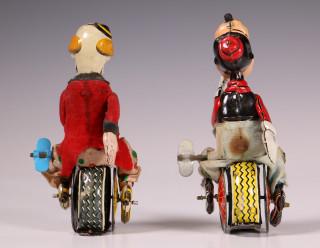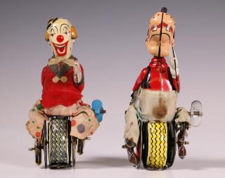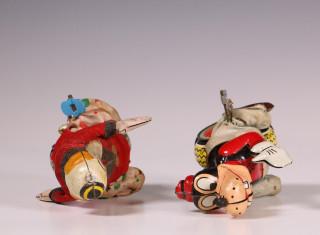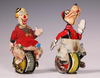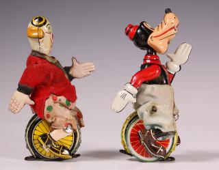 Japan, twee stuks blikken speelgoed, clown en goofy op eenwieler.