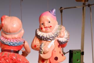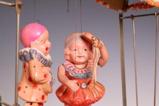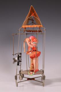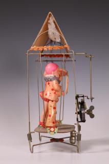 Uitgevoerd met twee celluloid figuren hangende in metalen frame met mechaniek. Compleet met vloer en luiffel.