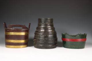 Met wilgentenen en koper omslagen, een met deksel. Hierbij een houten gekuipte boterton, omwikkeld met wilgentenen. Met genagelde initialen GVDM.