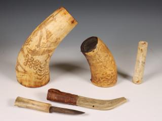 Twee gegraveerde hoornen bekers, benen mes en benen reken (?) instrumentje