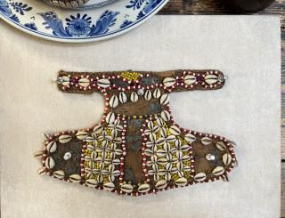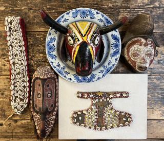 Drie tribale maskers, kraalwerk jasje en ceintuur.