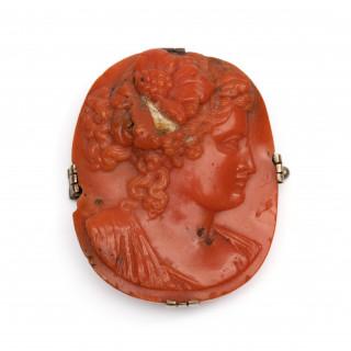 Pendant, also brooch, with cameo of red coral. With a silhouette of a lady with a flower in her hair (damage to flower and edge). In a silver plated cross-shaped brooch mounting