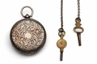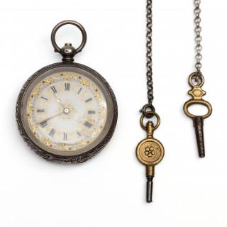 Switzerland, pocket watch. The dial decorated with foliage in gold. The back engraved with floral motifs. Hereby a silver anchor necklace with two base watch keys
