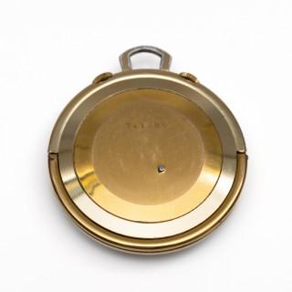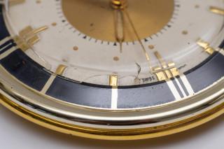 Met opwindmechaniek. De wijzerplaat opgebouwd uit een goudkleurige, witte en zwarte schijf. Beschadigingen aan het glas en verguldsel. Het uurwerk loop, maar wekker werkt niet. In zwart lederen etui