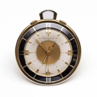 Jaeger leCoultre, Memovox gold plated travel alarm clock, 1970s. With winding mechanism. The dial consists of a gold-coloured, white and black disc. Damage to the glass and gilding. The timepiece runs, but the alarm clock does not work. In black leather case