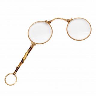 Gilded lorgnette, 19th century. The handle is guilloched and enamelled with a pattern of tortoiseshell and decorated with a salamander with green glass eyes.