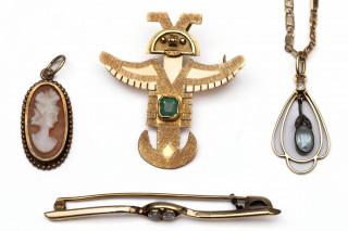Mexico, a 14 k. gold brooch/ pendant, set with an octagonal emerald. Hereby a bar brooch with two rose cut diamonds, a necklace with a delicate pendant and a cameo pendant