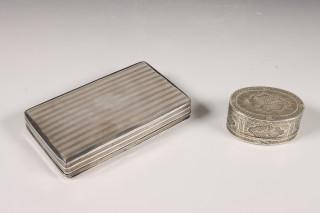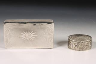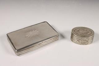 ovaal doosje met decoratieve graveringen, vergulde binnenzijde, scharnierende deksel, gemerkt, niet geïdentificeerd, 800st, tabaksdoos rechthoekig model met stralen krans versiering, geribd en lijnbanden decor, mt. J. Kuylenburg Schoonhoven 1842, 2 gehalte, deukjes