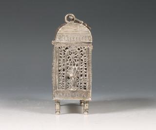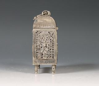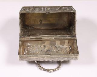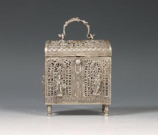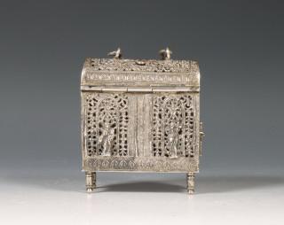 ajour langwerpig kistje met appliques van heiligen figuren, gebolde scharnierende deksel met hengsel in vorm van twee zeewezens, op hoge slanke pootje, mt. niet aangetroffen, jaarletter 1989, 2e gehalte