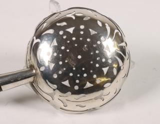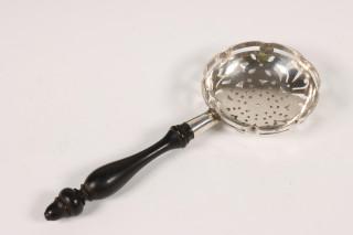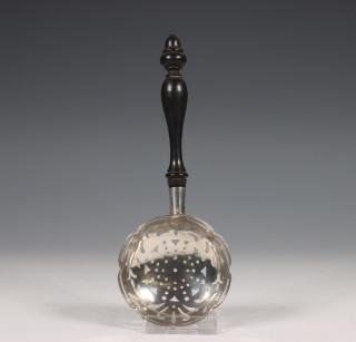 met gecontourneerde ronde bak en ebbenhouten balustervormige steel, mt. Hendrik Kamerlingh jr. Amsterdam 1755, gemerkt bijltje 1853-1953