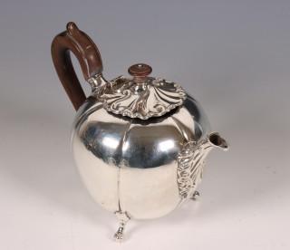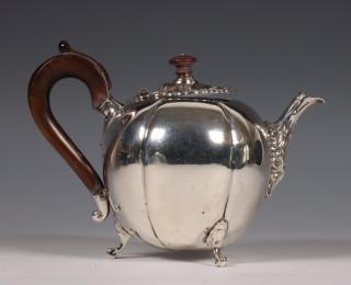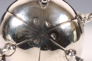 pompoenvormig model met voluutvormig hoornen oor, staand op drie gebogen pootjes met gekrulde voetjes, scharnierende deksel in acanthusbladvorm met geprofileerd plat rond hoornen knop, licht gebogen tuit met bladmotieven, mt. Martinus van Stapele 's- Gravenhage 1772, 1e gehalte, deukje, klep iets verbogen