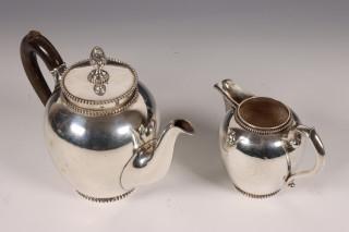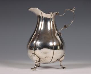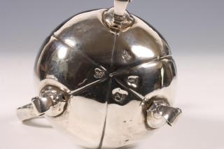buidelvormig gelobd model met sierlijk geknikt voluutvormig oor, en brede lipvormige tuit, staand op drie gebogen pootjes met omhoog gekrulde voetjes, mt. Martinus van Stapele 's- Gravenhage 1772, 1e gehalte, deukjes