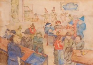 Café met figuren en muzikanten. Hierbij tekening door C. Spook met afbeelding van de Kromboomsloot.