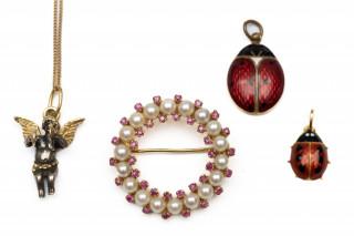 bezet met cultivé parels en kleine robijnen. Hierbij een fijn 14 kt. gouden collier met zilveren hanger in de vorm van een engel en twee bedels (één onedelm één 18 kt.) in de vorm van een lieveheersbeestje, beide met rood en zwart email.