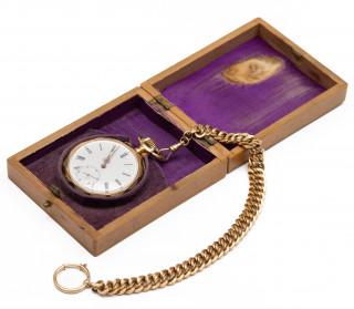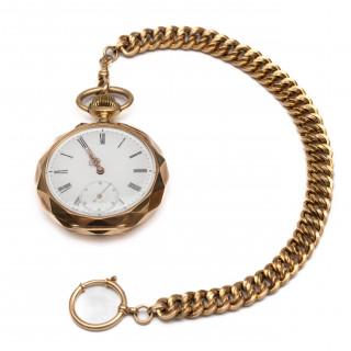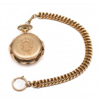 14 k. gold remontoir pocket watch with faceted case and base inner lid. On a double curb link watch chain. In wooden case.