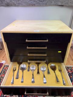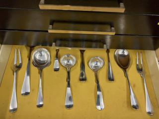 voornamelijk rond model met kam, diverse meestertekens en jaarletters, waarbij mt. Amsterdamse Keur c.v. Amsterdam 1954-h, twaalf viscouverts, twaalf diner vorken, twaalf bouillon lepels, twaalf dessert lepels, twaalf taartvorkjes, hierbij diverse sets diner en dessert lepels, kleine vorken, taartschep, paar aardappelschep, groentelepel, paar opdienlepels, paar sauslepels, twaalf diner- en twaalf kleine messen, paar vleesvorken en divers bijpassend eetgerei, voornamelijk 1e gehalte, met ladekastje 70er jaren