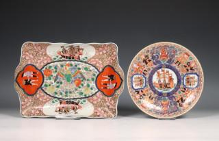 Japan, two Imari porcelain Namban dishes, 19th century, one rectangular and one circular, both decorated with Dutchmen and black ships (condition: the circular dish has a glaze crack to the base)