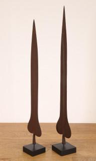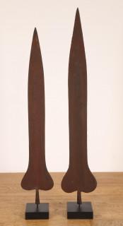 DRC., twee ijzeren zwaardvormige geldwaardes, op sokkel.