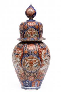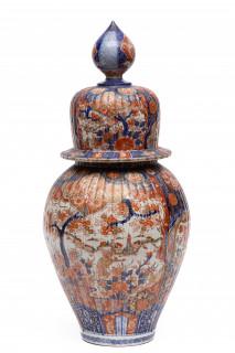 Japan, large Imari porcelain jar and cover, Meiji period (1868-1912), the ribbed sides decorated with flowers and birds, the cover with drop-shaped finial (condition: finial restored, chip to cover)