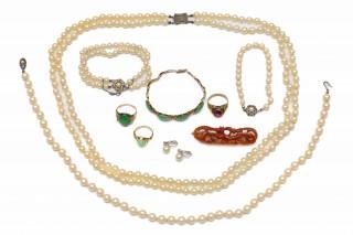drie met groene jade en één met bruine jade. Hierbij diverse bijous