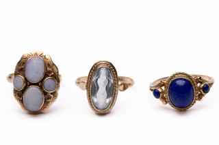 Three 14 k. gold rings, set with opal, synthetic spinel and lapis lazuli